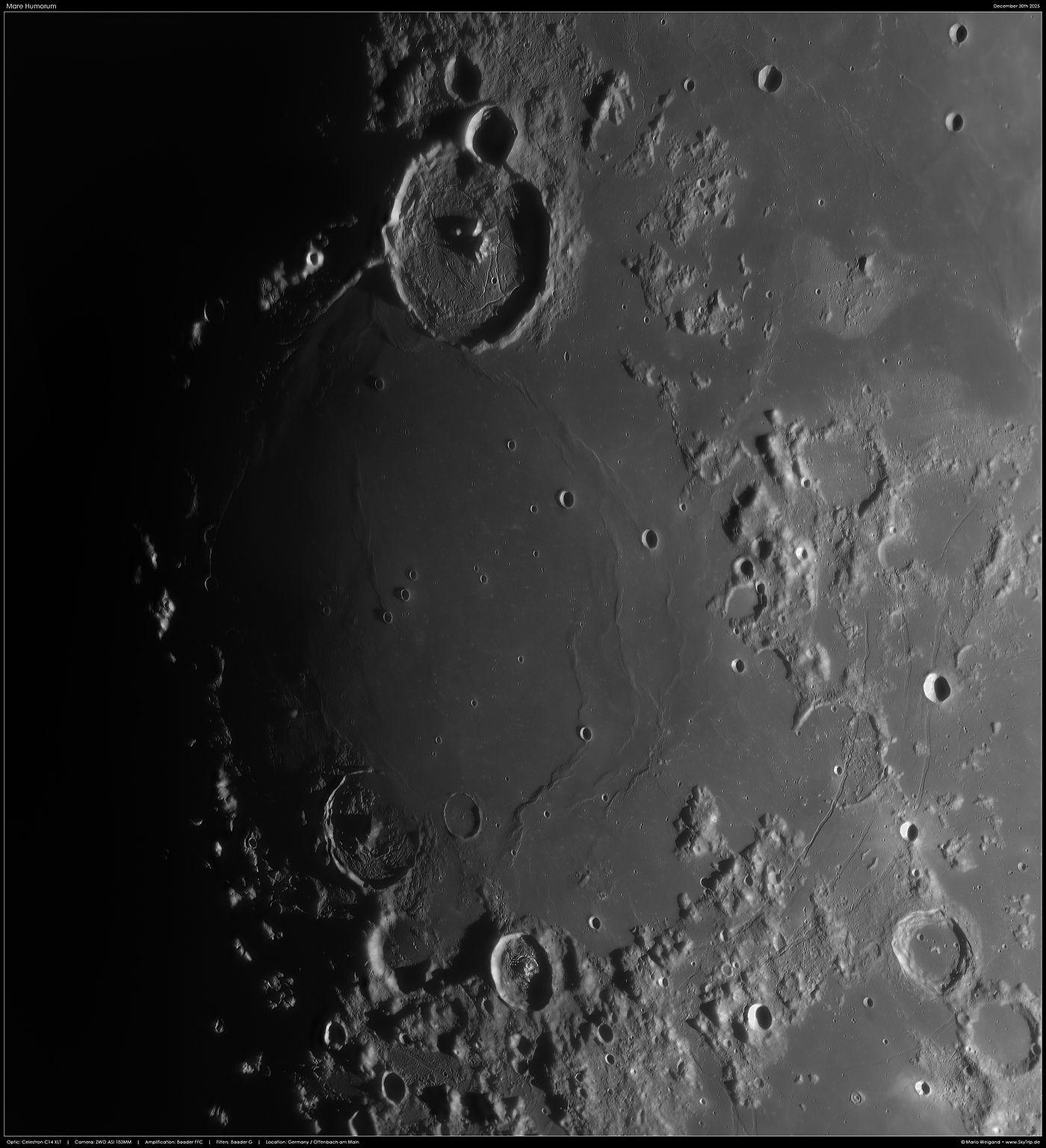 Kommentar: Das Mare Humorum (lateinisch für „Meer der Feuchtigkeit“) ist eine Tiefebene des Mondes mit einem mittleren Durchmesser von 420 km.
