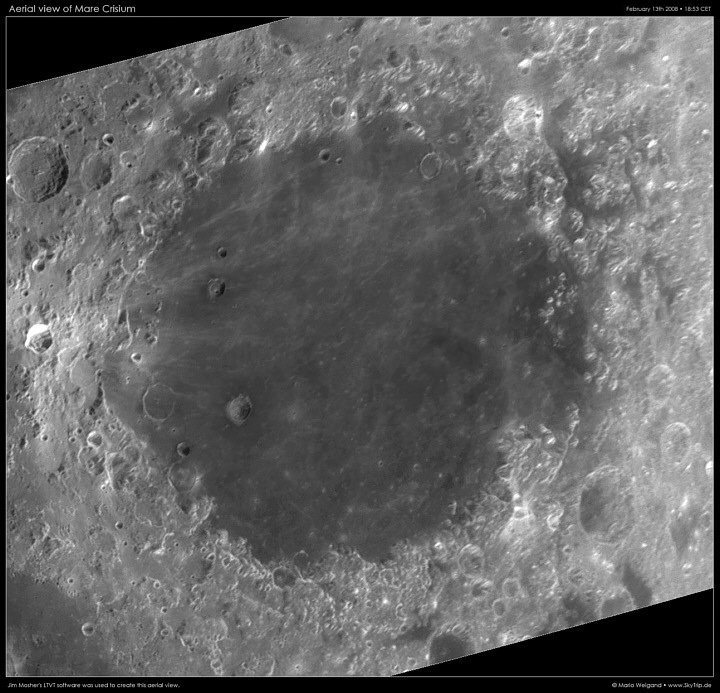 Kommentar: Von der Erde aus gesehen steht das Becken immer am östlichen Rand der Mondscheibe und so sehen wir es stets relativ stark perspektivisch verzerrt. Dadurch hat man den Eindruck es sei oval, in Nord-Süd-Richtung elongiert. Mare Crisium ist allerdings fast kreisrund. Tatsächlich ist sogar das Gegenteil der Fall: mit 620 km x 570 km ist es sogar leicht in Ost-West-Richtung elongiert.