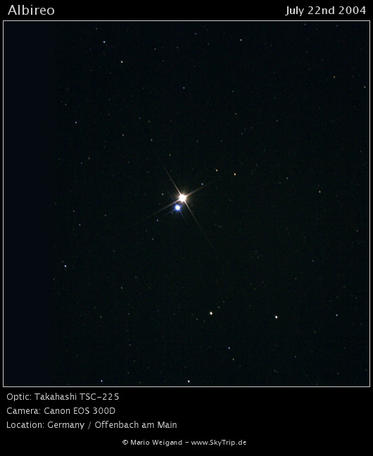 Kommentar: Albireo gehört zu den schönsten Doppelstern-Systemen, die mit einem kleinen Teleskop zugänglich sind.