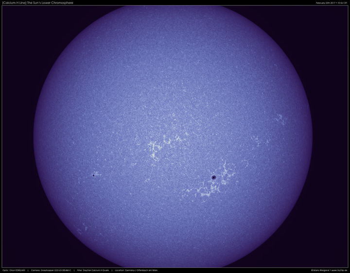 Erwartungsgemäß sieht man das gleiche wie mit einem CaK-Modul. Die H-Linie ist allerdings 36 Å näher am visuellen Spektralbereich, weswegen das Bild deutlich heller erscheint.