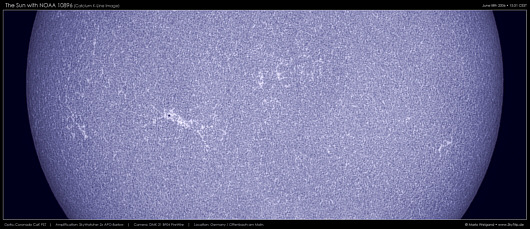 Kommentar: Ein Mosaik des Sonnenäquators mit dem CaK-PST. Es zeigt einige Fackelgebiete, sowie die aktive Region NOAA 10896 mit einem winzigen Sonnenfleck. Zwei der Fackelgebiete sind die Reste von NOAA 10895 und NOAA 10894. Hier eine gefärbte Version.