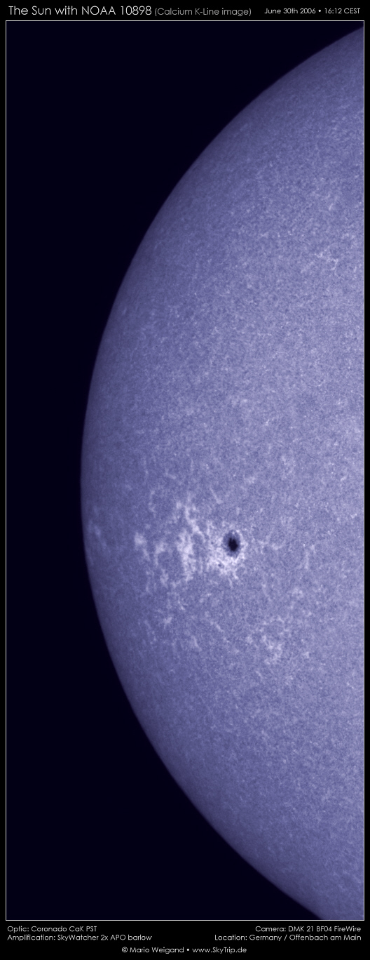 Kommentar: Ein Mosaik des Ostrandes am 30. Juni 2006. Etwa zwei Tage zuvor ist die aktive Region NOAA 10898 auf der der Erde zugewandten Seite der Sonne erschienen. Eine recht großer Sonnenfleck für das Aktivitätsmaximum der Sonne. Hier eine gefärbte Version.
