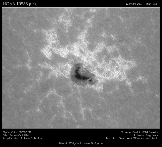 : Hier nochmal NOAA 10953 etwas näher rangeholt mit einer 3x Barlow. Mehr Vergrößerung war leider nicht drin, wegen des Seeings. Es sind übrigends die ersten Aufnahmen mit meinem umgebauten Kalziumfilter.