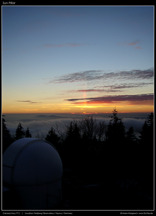 : Eine schöne Lichtsäule zeigte sich in der Abenddämmerung des 19. November. Im Vordergrund sieht man eine der beiden Kuppeln des Observatoriums des physikalischen Vereins Frankfurt auf dem kleinen Feldberg im Taunus.