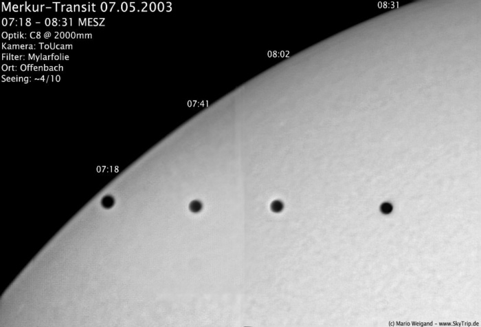 Kommentar: Eine grobe Eintritts-Sequenz aus vier Bildern, die ich in Abständen von 20-30 Minuten gemacht habe. Leider war das Seeing zu Anfang recht schlecht und Wolken machten es unmöglich, den Eintritt kontinuierlich zu beobachten und aufzunehmen.