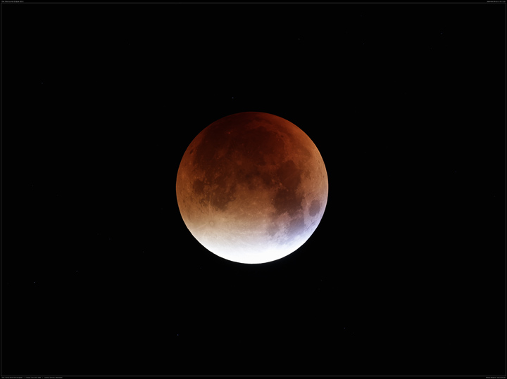 : (04:11 MESZ) Ein Foto vom Beginn der Totalität - nun sind die Farben sehr deutlich zu sehen. Es zeigt verschiedene Farbtöne, von eher gelblich über das übliche Dunkel- und Kupferrot bis zu Blau und einem Hauch von Pink.