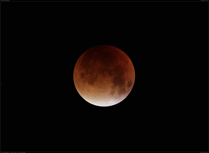 : (04:22 MESZ) Ein etwas fortgeschritteneres Stadium der Totalität die Farbtöne haben sich verändert. Die schwachen Blau- und Pinktöne sind verschwunden, hier dominieren Rot und Kupferrot.