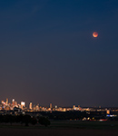 : Bei Mondaufgang war die Totalität schon voll im Gange. Es dauerte einige Zeit, bis sich der dunkelrote Mond gegen den Dämmerungshimmel durchsetzen konnte und über der Frankfurter Skyline sichtbar wurde.