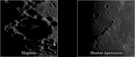 Das Bild wird von dem dramatischen Relief im Bereich des Mare Imbrium mit dem größten Mondgebirge Montes Apenninus, sowie Montes Caucasus und Montes Alpes dominiert.