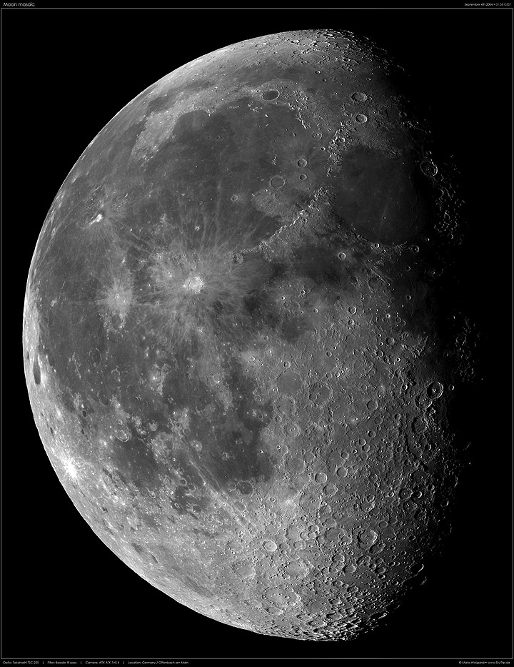 Kommentar: Dieses Mosaik entstand am 09.09.2004 an einem 9" Schmidt-Cassegrain Teleskop mit einer Atik ATK-1HS II-Kamera. Es wurde aus insgesamt 40 Einzelaufnahmen zusammengesetzt, die einem 4 Minuten langen Video entnommen wurden.
