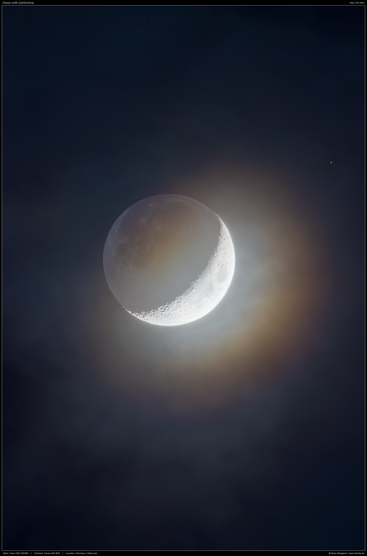 Der Erdschein bei leichter Bewölkung am Abendhimmel. Das Bild ist ein Komposit aus zwei verschiedenen Belichtungen, um den Erdschein gleichzeitig mit der von der Sonne beleuchteten Seite zu zeigen. Der helle Stern im Bild ist υ Gem.
