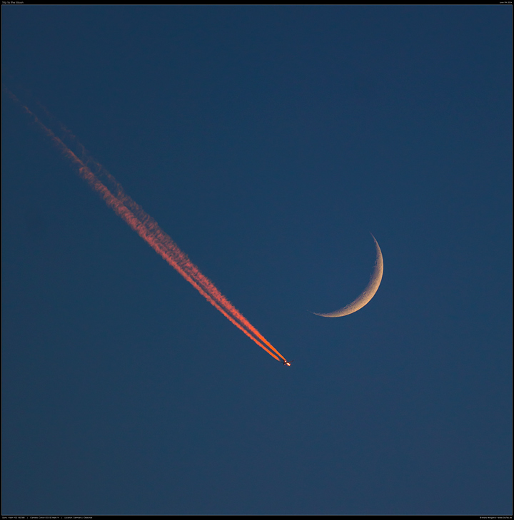 Ein Zufallstreffer am Abendhimmel: Ein Verkehrsflugzeug fliegt im Abendlicht am Mond vorbei und sorgt zusammen mit dem noch blauen Himmel für einen schönen Farbkontrast.