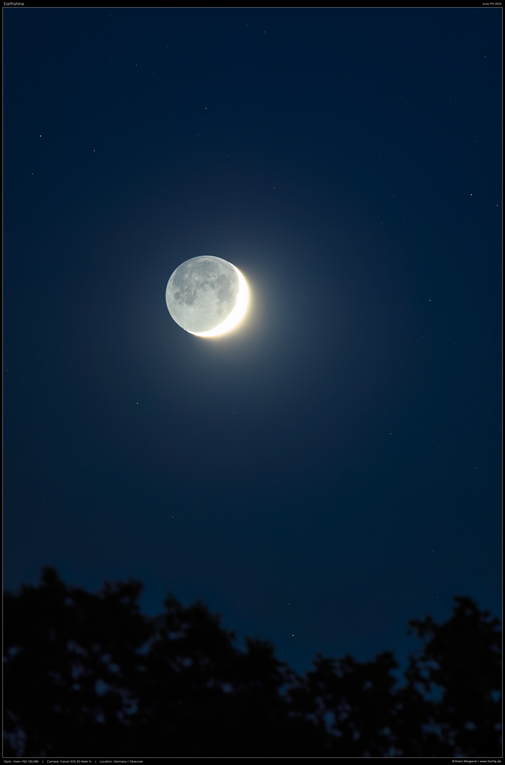 Am 9. Juni 2024 zeigte sich der junge Mond mit sehr deutlichem Erdschein in einem lockeren Sternfeld zwischen den Sternbildern Krebs und Zwillinge.