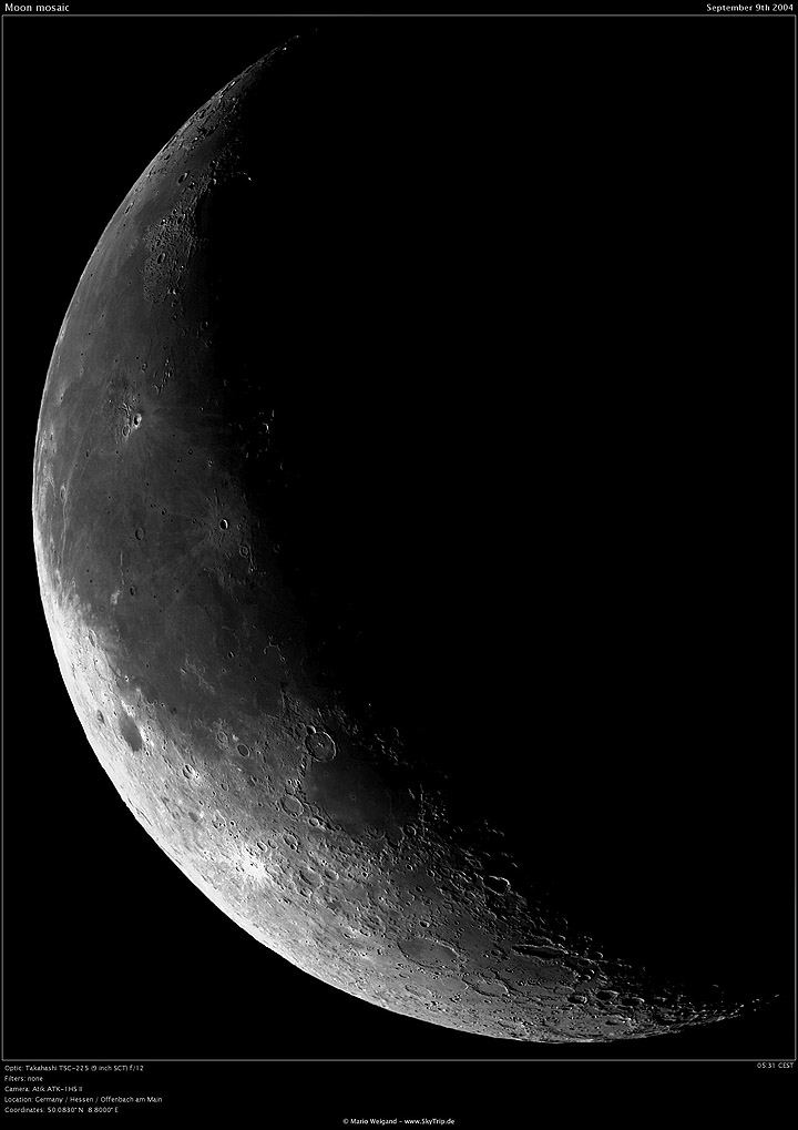 : Dieses Mosaik entstand am 09.09.2004 an einem 9" Schmidt-Cassegrain Teleskop mit einer Atik ATK-1HS II-Kamera. Es wurde aus insgesamt 40 Einzelaufnahmen zusammengesetzt, die einem 4 Minuten langen Video entnommen wurden.