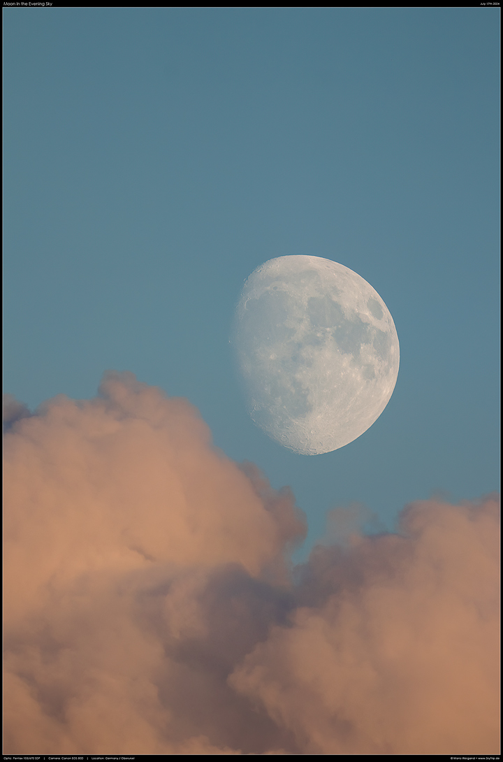 Kommentar: Der zunehmende Mond erscheint am Abendhimmel über horizontnahen Cumulus-Wolken. Die Aufnahme entstand am 17. Juli 2024 mit der Canon EOS 80D am Pentax 105/670 SDP.