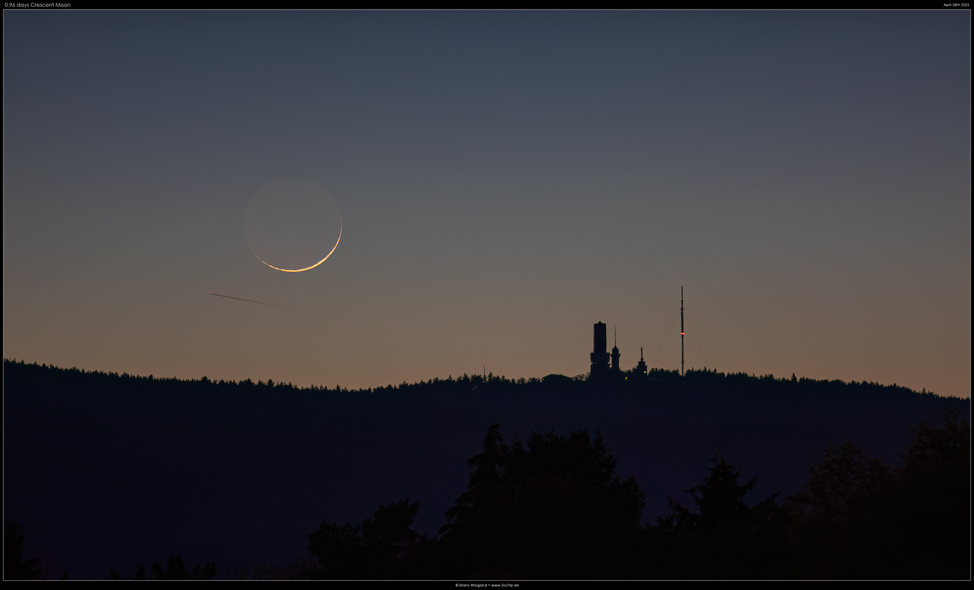 Kommentar: Am 28. April 2025 war die dünne Mondsichel mit einem Alter von nur 0,96 Tagen sehr gut am klaren Dämmerungshimmel über dem Felberg im Taunus zu beobachten. Auch der Erdschein war gut zu sehen.