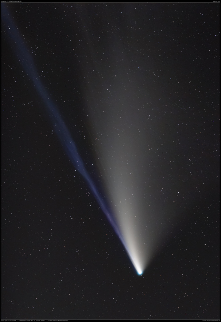 Am 21. Juli habe ich den Komet mit 135 mm Brennweite und Vollformat-Kamera aufgenommen und selbst hier reichte das Bildfeld nicht aus, um ihn vollständig zu zeigen.