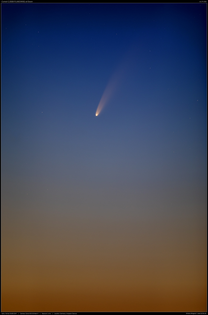 Kommentar: Nachdem zwei Kometenhoffnungen dieses Jahr schon verpufft sind, hat es F3 NEOWISE nun offenbar geschafft, die Sonnennähe zu überleben. Am 7. Juli konnte ich ihn gegen 3:30 in der Morgendämmerung über dem Taunus erwischen. Der 1 mag helle Komet war auch mit bloßem Auge ein leichtes Objekt.