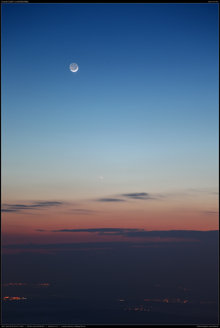 ein leichtes Objekt. Das obige Bild gibt eine Übersicht der Szene mit Mond, Komet und Horizontkulisse.