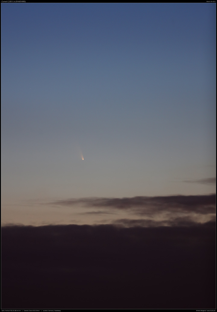 Kommentar: Hier ist ein weiteres Bild von Komet C/2011 L4 (PANSTARRS), aufgenommen mit dem Pentax-M* SMC 67 300 mm f/4 ED (IF) und der EOS 5D Mark II. Da Wolken über dem Rhein-Main-Gebiet aufzogen, habe ich spontan versucht, so gut es Berufsverkehr freitags eben geht, nach Süden auszuweichen. Bis Heidelberg bin ich nur gekommen. aber immerhin war so eine erneute Sichtung möglich. Das Auffinden gelang mit dem Fernglas sehr viel einfach als noch zwei Tage zuvor. Leider konnte ich ihn nicht wieder bis kurz vor Untergang verfolgen, da auch hier die Bewölkung schnell zunahm.