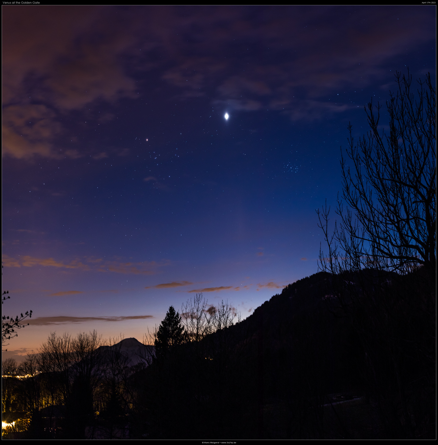 : Mitte April verabschieden sich die Sternbilder des Winterhimmels uns verschwinden nach und nach in der Abenddämmerung. Dieses Jahr gesellte sich die Venus dazu und stand dabei am goldenen Tor der Ekliptik – zwischen Plejaden und Hyaden.