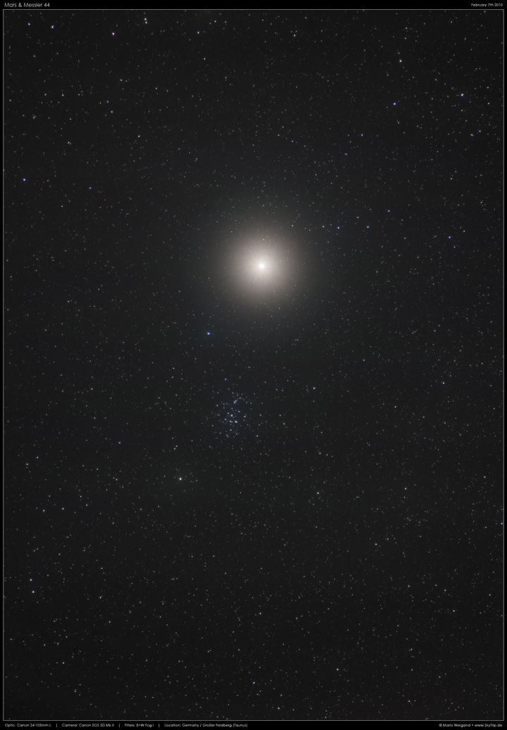 Kommentar: Mars nur 4° nördlich von Messier 44. Seine Oppositionsschleife führt den roten Planet 2010 durch das Sternbild Krebs. Die Ekliptik verläuft knapp südlich des Sternhaufens, wodurch es zwangsläufig immer wieder Begegnungen mit den Planeten oder dem Mond gibt.