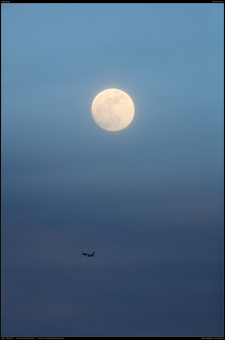 Kommentar: Herein ziehende Zirrusbewölkung kündigte bereits das nahende schlechte Wetter an, daoch die Beobachtung des Mondaufgangs blieb mir nicht verwehrt. Begegnungen des Mondes mit Flugzeugen im Landeanflug sind im Rhein-Main-Gebiet keine Seltenheit.