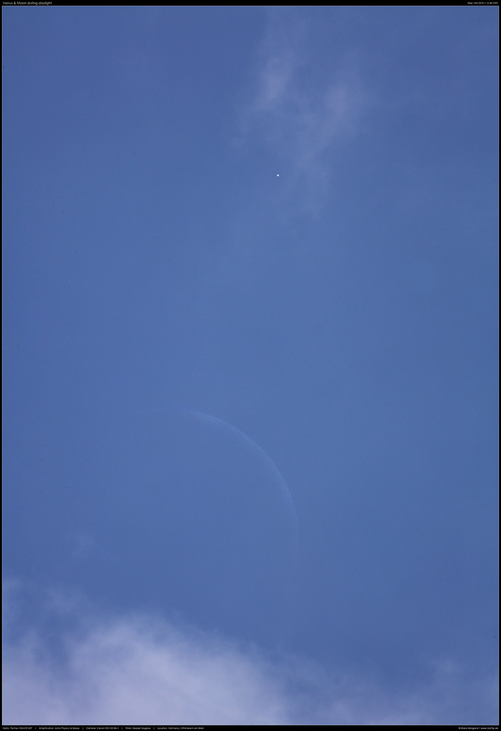 Kommentar: Am 16. Mai 2010 kam es gegen 11:15 zu einer engen Begegnung zwischen Venus und Mond. Venus stand zur Zeit der größten Annäherung nur etwa 11' vom Mondrand entfernt.