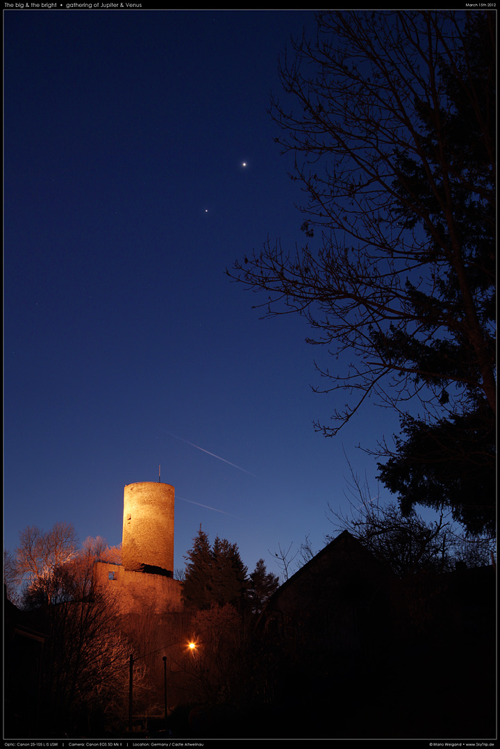 Diese Aufnahme zeigt die beiden Planeten nur 2 Tage danach am Dämmerungshimmel über der Burgruine von Altweilnau im Taunus.