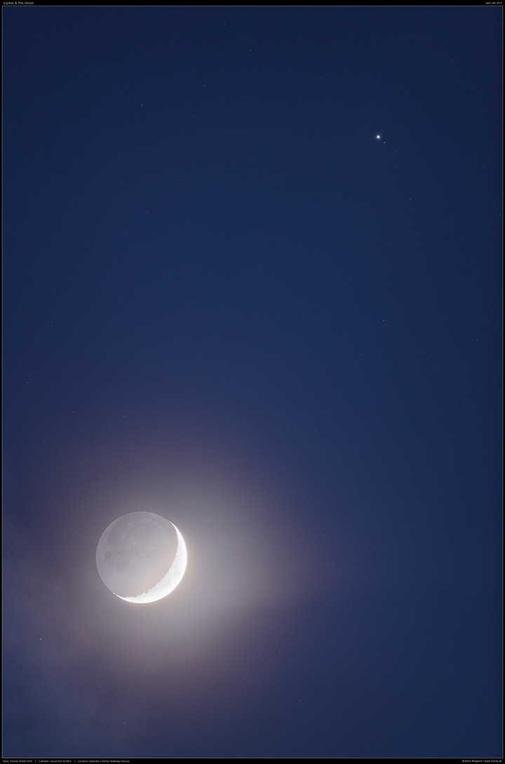 Kommentar: Am 14. April 2013 zog die junge Mondsichel, durch den Erdschein verziert, in nur etwa 2,5° Winkelabstand am Riesenplanet Jupiter vorbei. Auf dieser Aufnahme erkennt man neben Jupiter auch die 4 galiläischen Monde, Europa und Ganymed standen sehr nah beieinander.