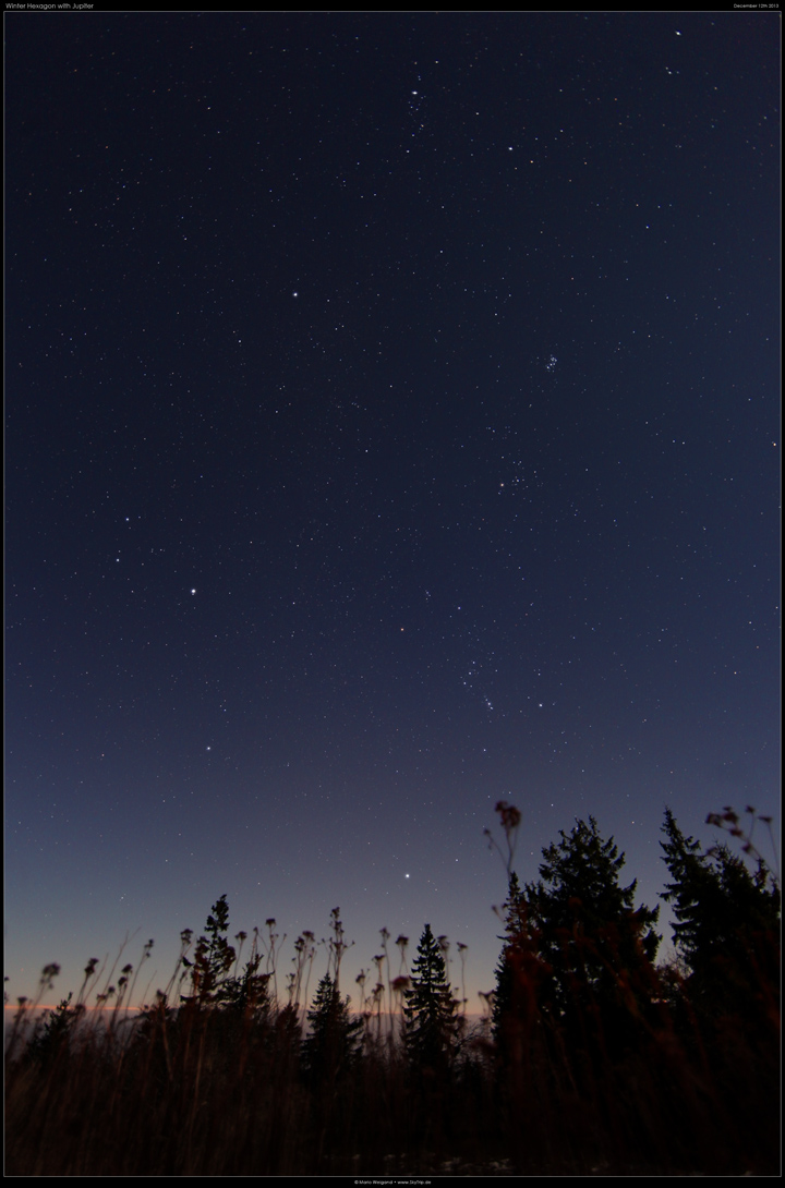 : Eine weitere Impression des vom Mond erhellten Winterhimmels mit Jupiter im Wintersechseck. Die Aufnahme entstand in einer klaren Nacht über der Nebeldecke auf dem Kleinen Feldberg.