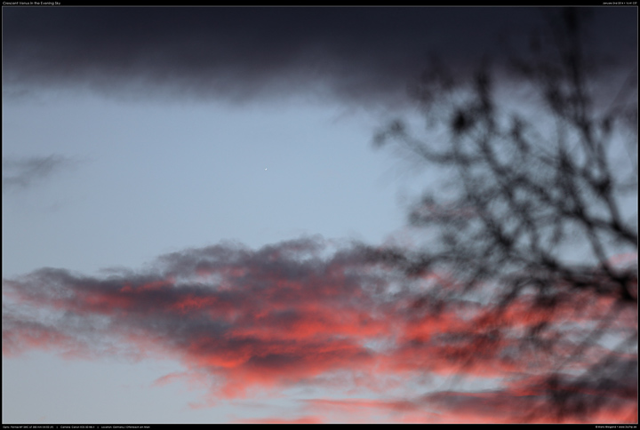 : Kurz vor oder nach der unteren Konjunktion ist der scheinbare Durchmesser der Venus so groß, dass man die Sichelform bereits in einem Fernglas sehen kann. So war es auch Anfang 2014, wie diese Aufnahme mit einem 300 mm Objektiv zeigt.