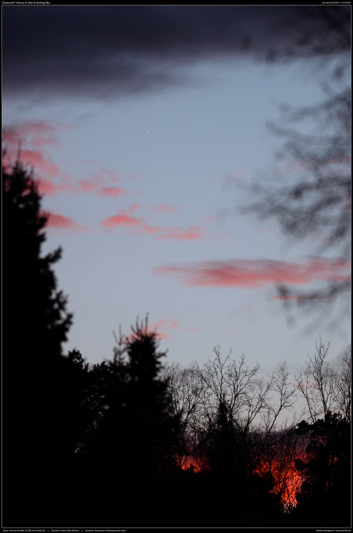 : Kurz vor oder nach der unteren Konjunktion ist der scheinbare Durchmesser der Venus so groß, dass man die Sichelform bereits in einem Fernglas sehen kann. So war es auch Anfang 2014, wie diese Aufnahme mit einem 300 mm Objektiv zeigt.