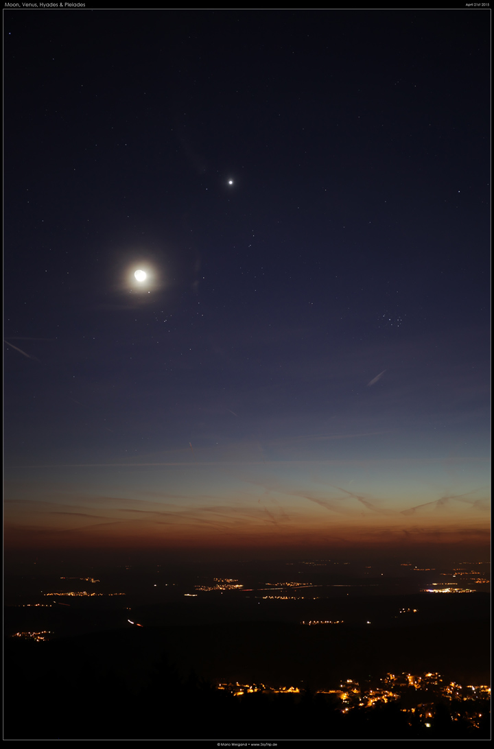 Kommentar: Am 21. April 2015 kam es zu einer schönen Begegnung von Mond und Venus bei den offenen Sternhaufen der Hyaden und der Plejaden.