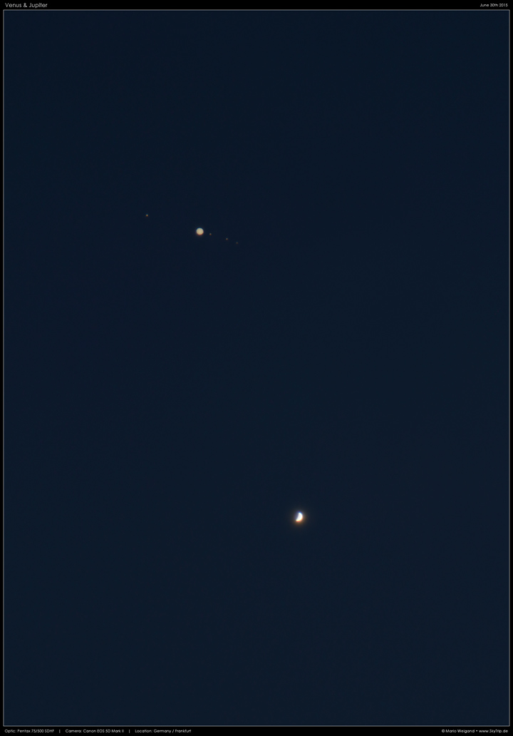 Kommentar: Jedes Jahr kommen sich Jupiter und Venus relativ nah, jedoch selten mit so geringen Winkelabstand von rund 23', wie am 30. Juni 2015. Die schöne Konjunktion war bei bestem Wetter am Abendhimmel über Frankfurt zu sehen.