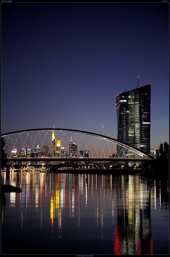 : Jedes Jahr kommen sich Jupiter und Venus relativ nah, jedoch selten mit einm so geringen Winkelabstand von rund 23' wie am 30. Juni 2015. Die schöne Konjunktion war bei bestem Wetter am Abendhimmel über Frankfurt zu sehen.