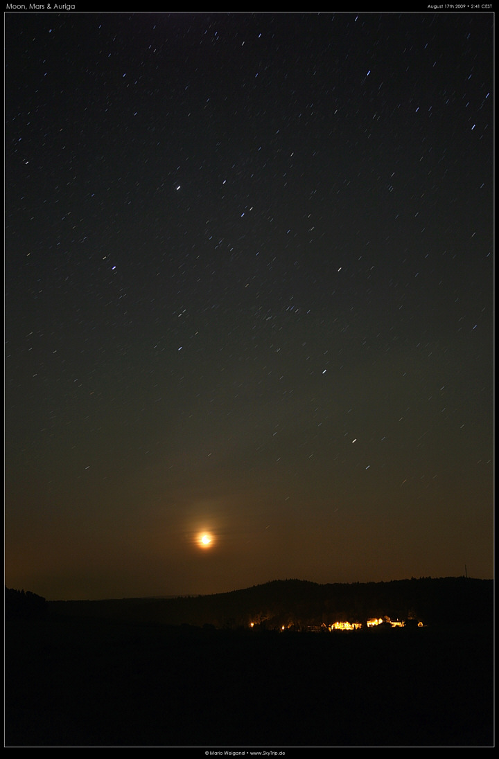 : Der aufgehende Mond zusammen mit Mars und dem Sternbild Auriga kündigen ein baldiges Ende einer Beobachtungsnacht an. Im Vordergrund sieht man die wenigen Lichter von Cratzenbach im Taunus.