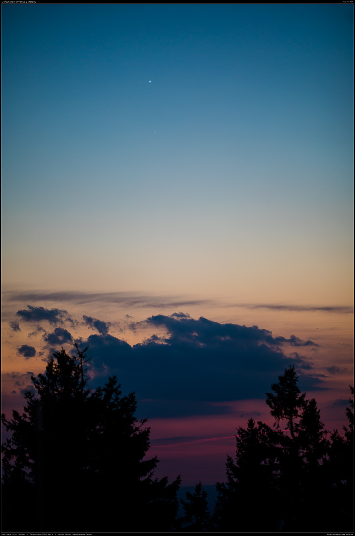 Merkur stand zu dieser Zeit rund 1,5° unterhalb der hellen Venus, die sich schon bald vom Abendhimmel verabschieden wird.