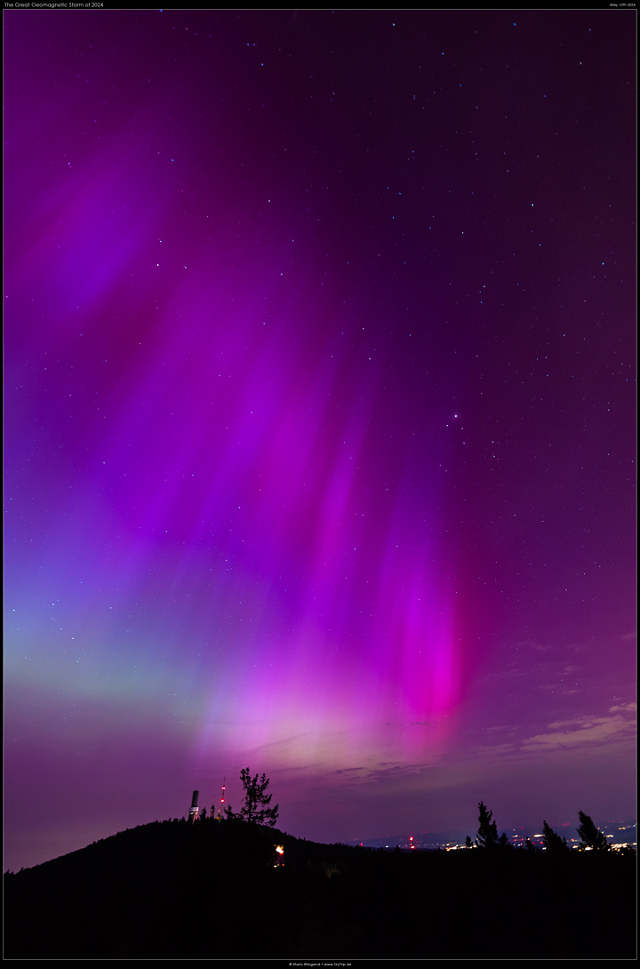Kommentar: Am 10. Mai 2024 kam es in Folge eines starken Flares der großen Fleckengruppe AR 3664 wenige Tage zuvor zu einem starken geomagnetischen Sturm. Intensives Polarlicht konnte über Deutschland beobachtet werden.