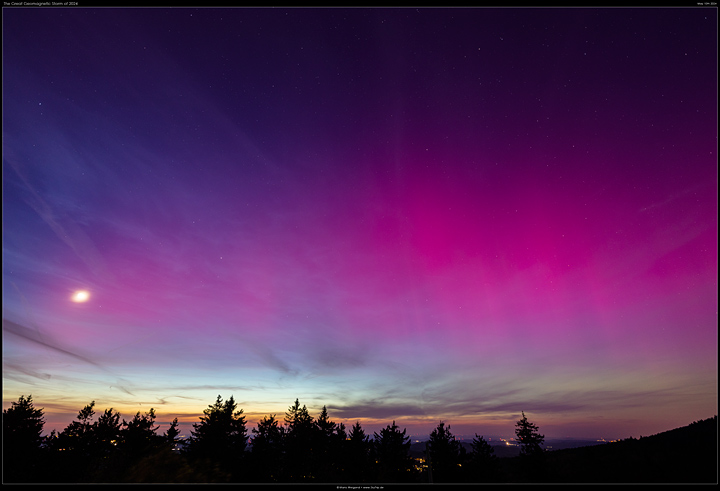: Am 10. Mai 2024 kam es in Folge eines starken Flares der großen Fleckengruppe AR 3664 wenige Tage zuvor zu einem starken geomagnetischen Sturm. Intensives Polarlicht konnte über Deutschland beobachtet werden.