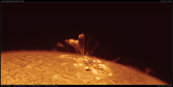 Kommentar: Nur einen Tag nach den schönen Loop-Protuberanzen am Ostrand der Sonne ging es auf der gegenüber liegenden Seite rund. Die riesige Fleckengruppe NOAA 13664, die uns drei Tage zuvor ein phantastisches Polarlicht beschert hatte, verabschiedete sich nun mit Feuerwerk.