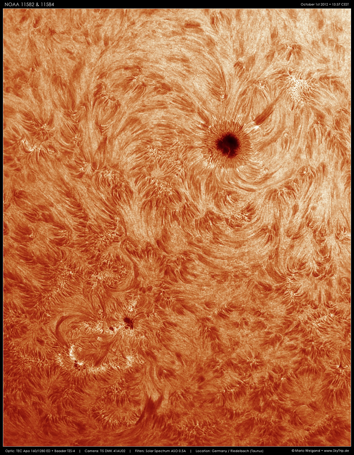 Anfang Oktober 2012 war die Aktivität der Sonne zwar verhalten, bei guten Bedingungen gab es dennoch den einen oder anderen größeren Sonnenfleck zu sehen. Diese Aufnahme zeigt den zu dieser Zeit größten: NOAA 11582. Südlich davon ist zusätzlich NOAA 11584 erkennbar.