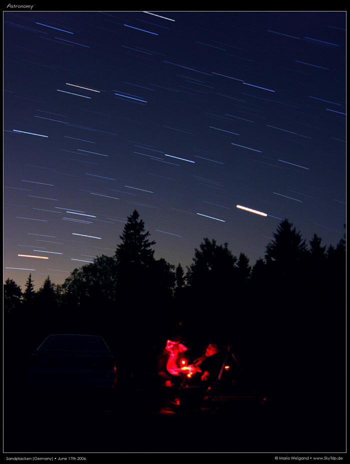 Kommentar: Eine Streifenaufnahme, die während einer entspannten und erfolgreichen Beobachtung auf dem Sandplacken antstand. Mit Jupiter und Skorpion im Hintergrund und aktivem Hobby-Astronom im Fordergrund. Spurlänge: 15 Minuten.