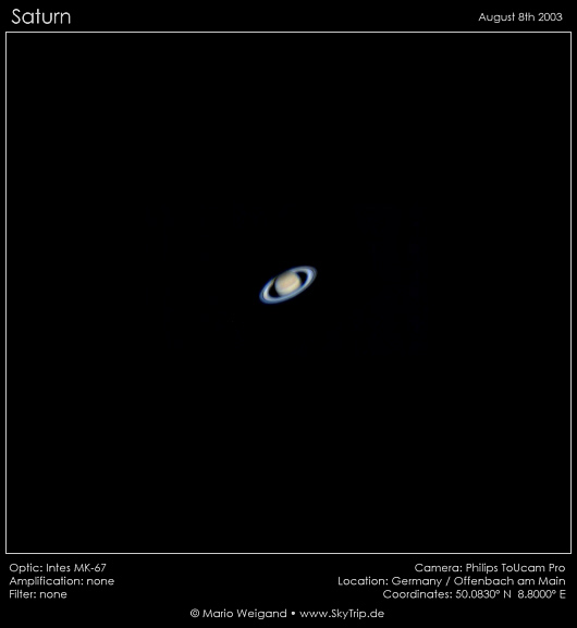 : Der erste Saturn der Saison, um diese einzuleiten. Leider war nicht mehr möglich, da Saturn hinter Schleierwolken hing und für höhere Vergrößerung nicht genug Licht übrig war... Zudem stand er auch noch ziemlich niedrig über dem Horizont.