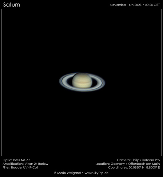 Kommentar: So langsam wird es was, allerdings durfte ich wieder durch eine Dunstschicht fotografieren. Für die 3-fach Barlow war leider nicht genug Licht übrig. Und das Seeing war auch nicht die Bombe, es lag bei ca. 6/10. Aber ich denke, jetzt werde ich am Ball bleiben, so langsam lohnt es sich wieder, Saturn zu fotografieren.
