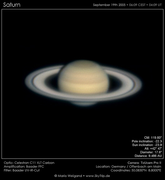 Die Ringlage ist deutlich verändert im Vergleich zum Anfang des Jahres. Die nördliche Halbkugel ragt nun wieder deutlich hinter den Ringen hervor.
