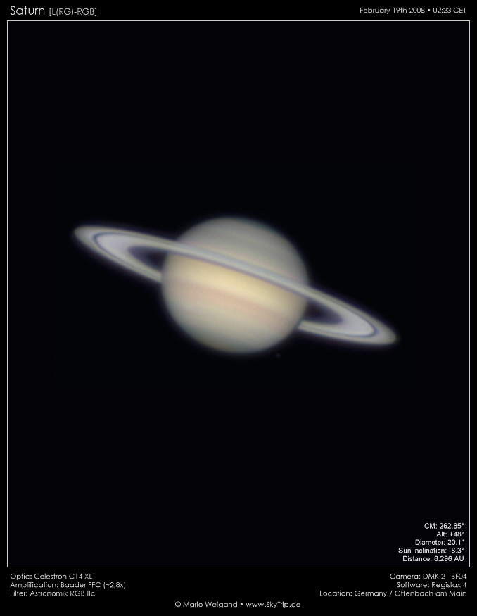 der bereits auf einigen anderen Amateur-Aufnahmen erschienen war. Zudem ist noch Thetys mit auf das Bild geraten, sie steht ganz nah an der Planetenscheibe.