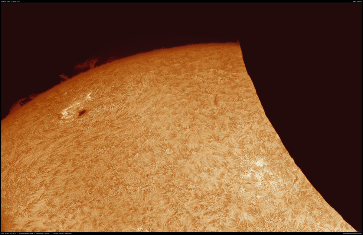 : Großaufnahme des Mondrandprofils und Aktive Region NOAA #4046 mit ein paar Protuberanzen. Sehr deutlich sind Berge und Täler am Mondrand zu erkennen. Die Aufnahme entstand mit dem Baader SunDancer II H-Alpha-Filter am TEC 160ED Refraktor.