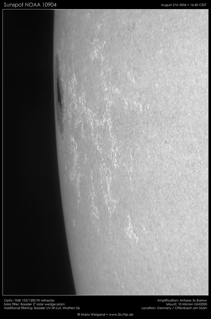 : Kurz bevor NOAA 10904 am Westrand verschwand konnte ich noch eine letzte Beobachtung in den französischen Alpen durchführen. So nahe am Sonnenrand ercheint der Fleck wie eine Grube, was man als