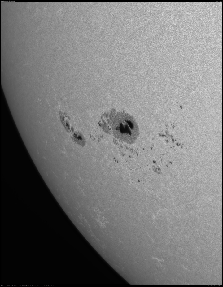 Kommentar: Im August 2024 gab es auf der Sonne erneut eine stattliche Fleckengruppe zu beobachten, wenn auch bei weitem nicht so groß, wie im Mai. Dennoch sorgte auch diese Gruppe immerhin für ein wenig Polarlicht in Mitteleuropa. Das Bild entstand am Baader 11" Triband SCT mit Herschelkeil und der ZWO ASI183MM Pro Kamera.